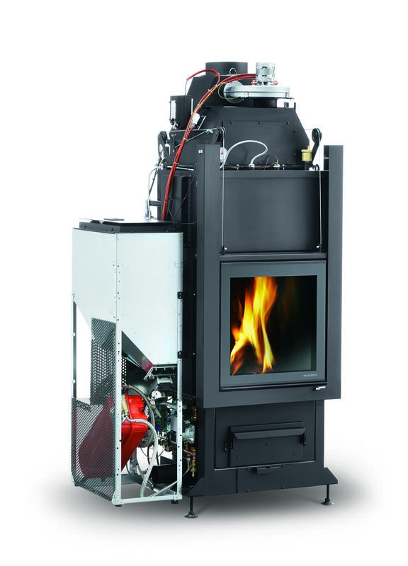 Představujeme Vám unikátní krbovou vložku s teplovodním výměníkem, které umožňuje spalovat jak kusové dřevo (brikety) tak dřevěné pelety o Ø 6 mm. Provoz vložky kromě některých základních úkonů, kterým se nikdy nevyhnete, je plně automatizovaný. Provoz na pelety je zcela automatický, dochází k automatickému zapálení buď zmáčknutím tlačítka, nebo nastavením času sepnutí. Následně může krbová vložka na minimální výkon hořet až 36 hodin. V případě topení dřevem stačí vložit během topení peletami do topeniště kusová polena a krbová vložka rozpozná, že se má přepnout do módu pro spalování dřeva. Dokonce i zapalování dřeva může probíhat automaticky. Pokud si připravíte na rošt polena a třísky, dojde automaticky ve zvolený čas pomocí pelet k zapálení kusové dřeva.